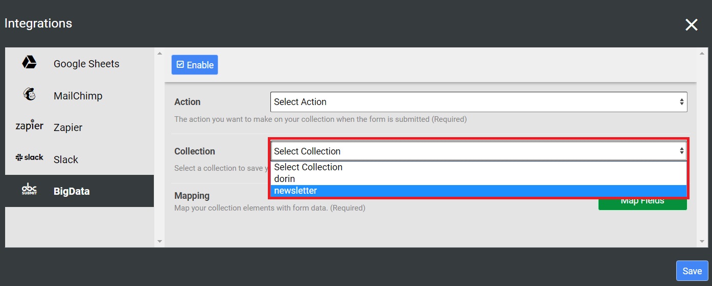 In order to send the right form data to your BigData Collection, you must map your form fields to your collection columns.