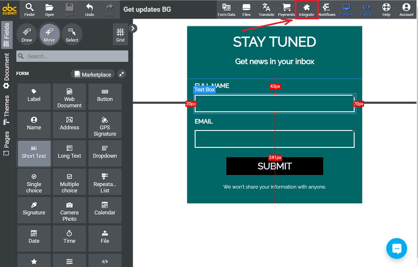 Open the form you want to integrate with BigData Collection in edit mode and then click on the Integrate button which is placed in the top-right side of your screen.