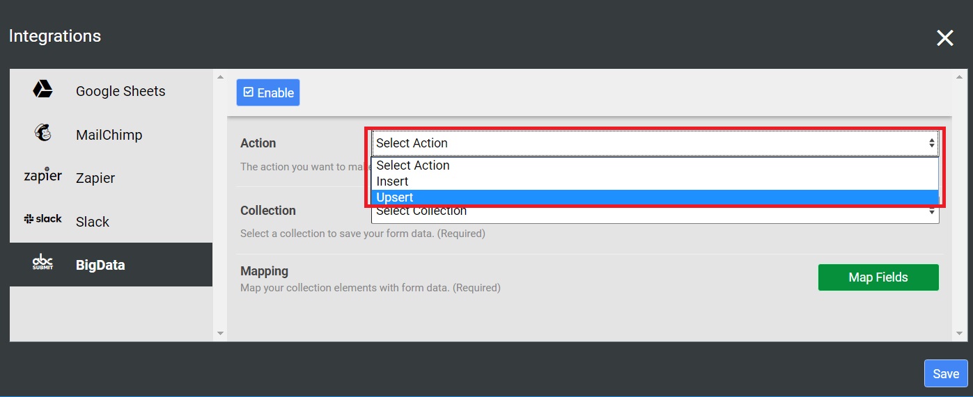 - Insert action – by choosing the Insert action, when your form is submitted a new row is added in your BigData collection.
